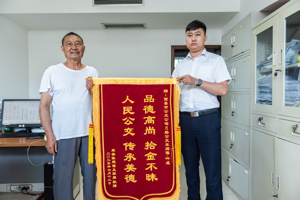 2025年7月28日,年逾八旬的市民陈大爷及其家属来到月城公交公司办公地点,将一面写有“品德高尚,拾金不昧,人民公交,传承美德”的锦旗,送给8路驾驶员叶成师傅,感谢这位好司机急人所急、物归原主的善行义举。这面锦旗,连接着十几天前一段充满焦急与温暖的公交故事。