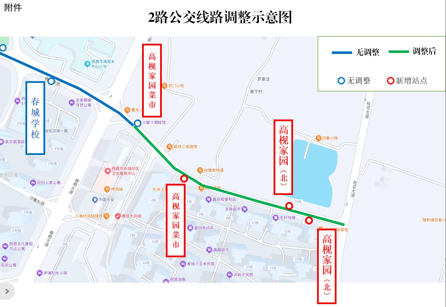 为进一步满足高视家园周边群众的出行需求,经主管部门批准,我公司将于2025年5月15日延伸2路公交线路至桂花大道路口。增设站点 “高枧家园(北)”,原“高枧家园(北)”站点更名为“高枧家园菜市”。